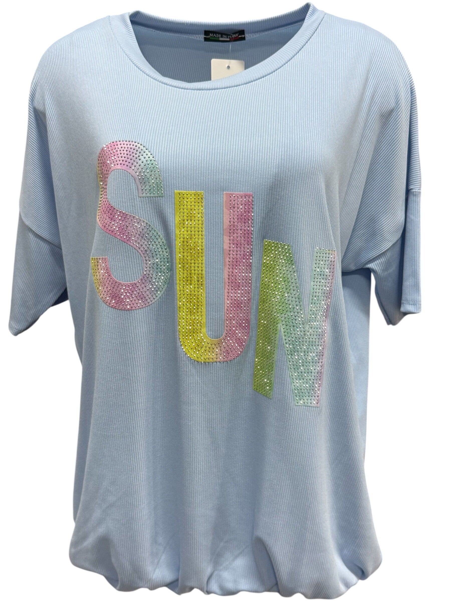 Een heerlijk ruimvallend shirt met een speelse en opvallende “SUN” print in kleurrijke steentjes. Perfect voor een casual, zomerse look!