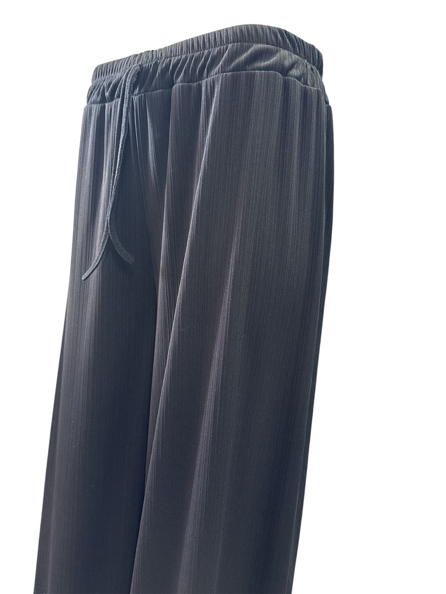 De broek heeft een subtiel klein ribpatroon in de stof, wat zorgt voor een speelse en moderne uitstraling. Dankzij de elastische band rondom zit hij extra comfortabel en trek je hem makkelijk aan.