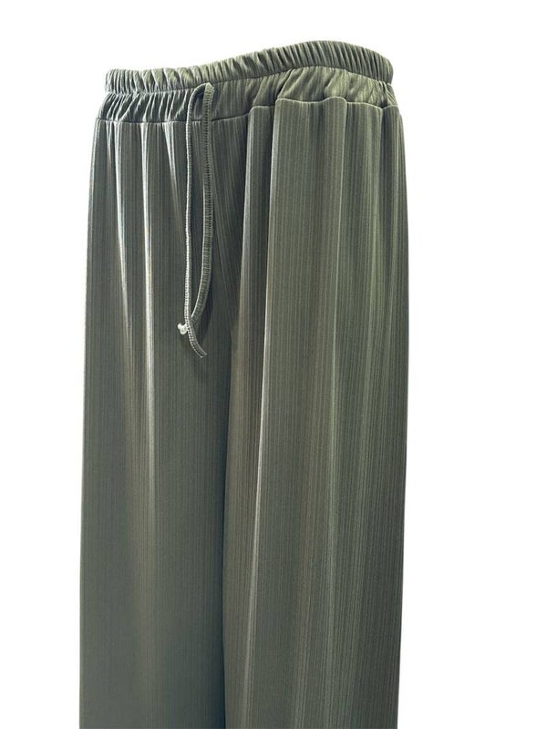 De broek heeft een subtiel klein ribpatroon in de stof, wat zorgt voor een speelse en moderne uitstraling. Dankzij de elastische band rondom zit hij extra comfortabel en trek je hem makkelijk aan.