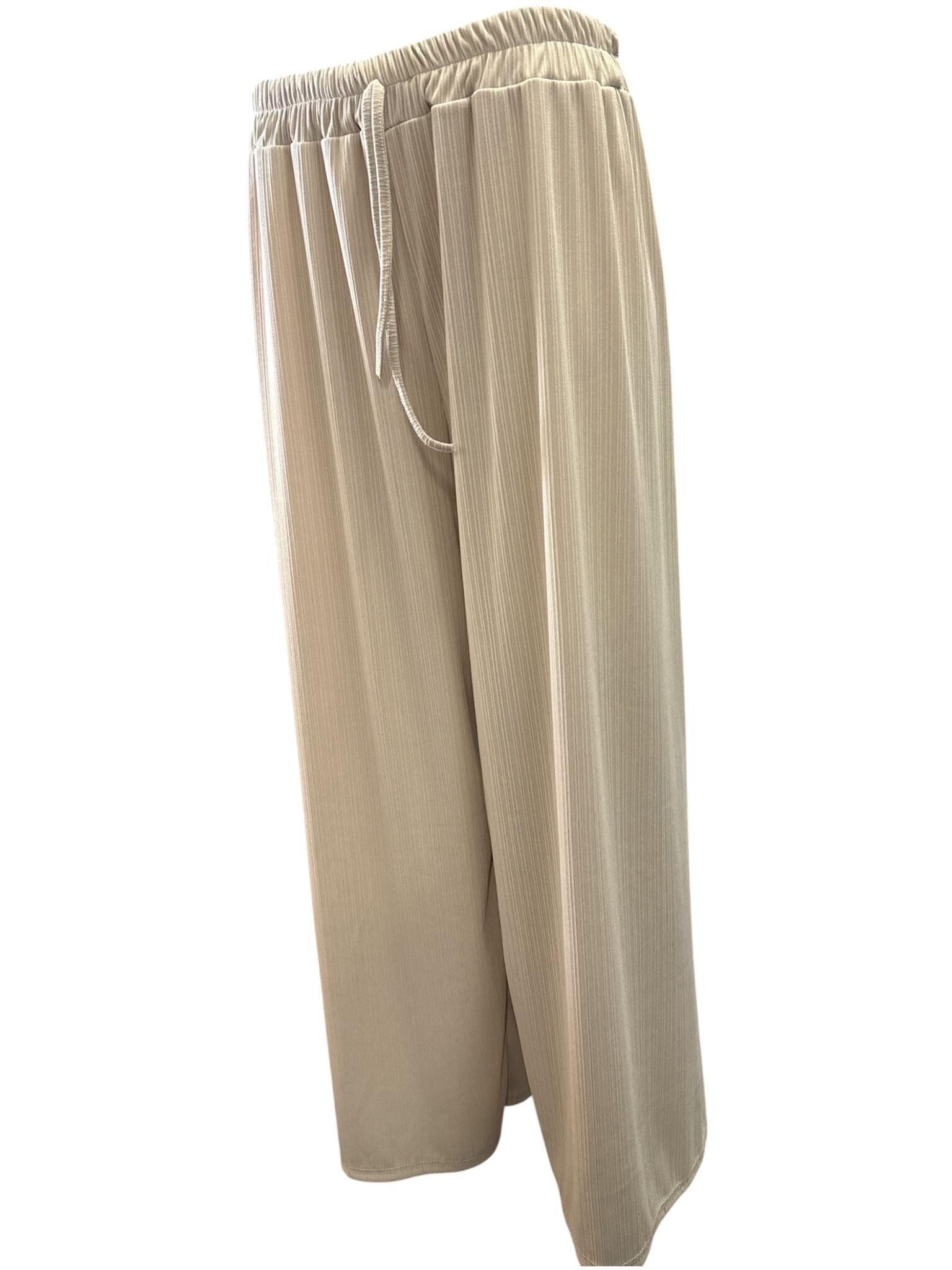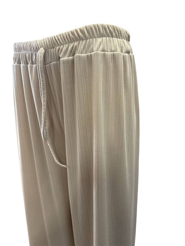 De broek heeft een subtiel klein ribpatroon in de stof, wat zorgt voor een speelse en moderne uitstraling. Dankzij de elastische band rondom zit hij extra comfortabel en trek je hem makkelijk aan.