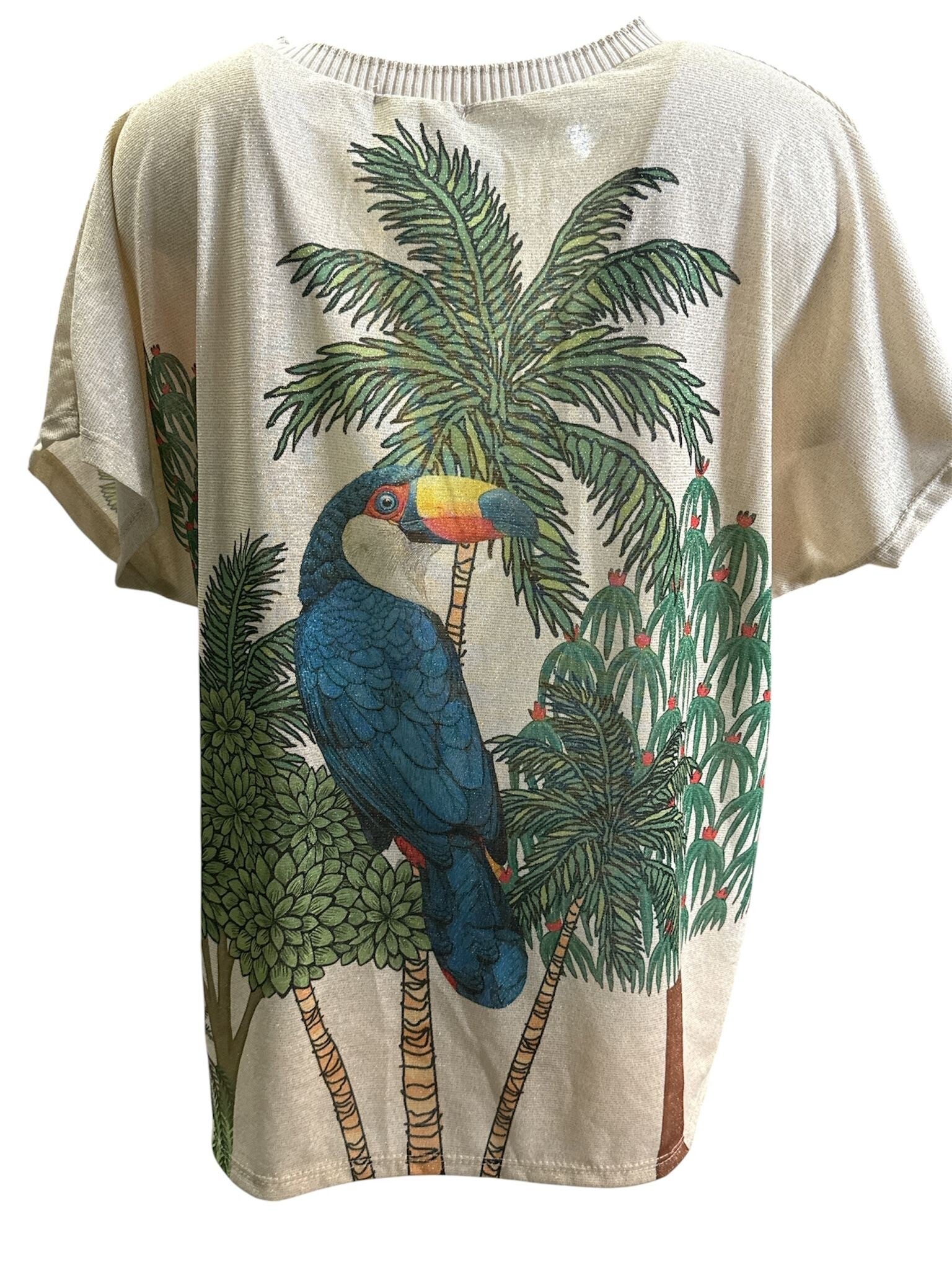 Dit shirtje steelt echt de show met zijn kleurrijke print vol tropische vibes. De prachtige details met vogels en bladeren geven je outfit meteen een speelse en zomerse uitstraling.