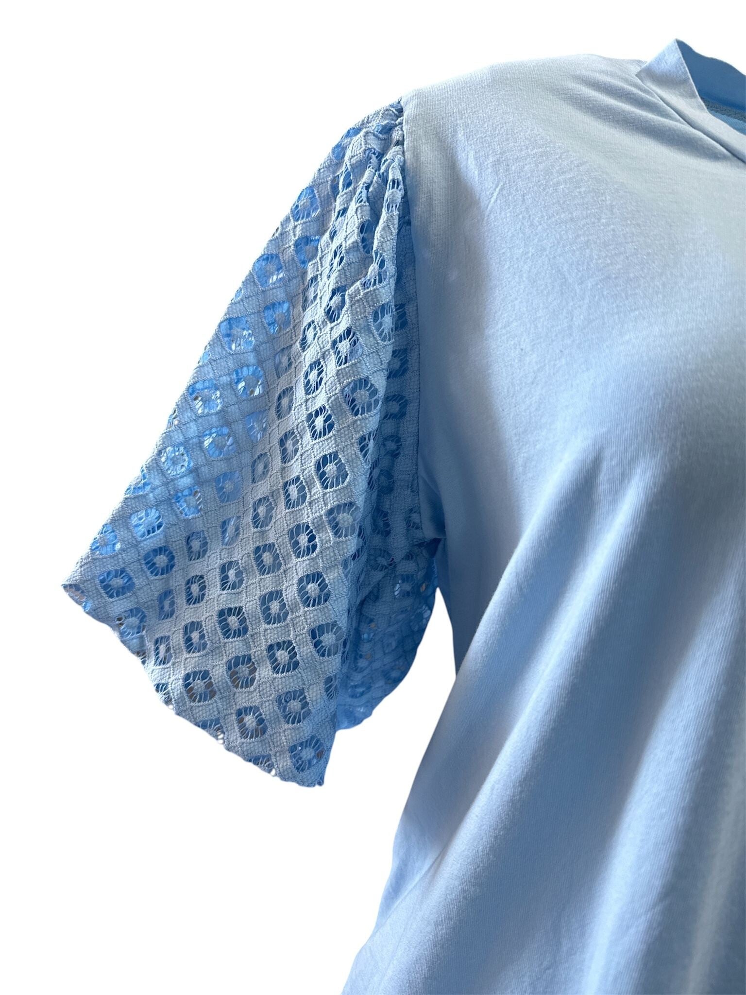 De combinatie van een soepelvallend model met de speelse, opengewerkte pofmouwen maakt ‘m nét even anders dan een basic.